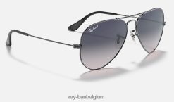 draag een rb3025 aviator gradiëntzonnebril met een gunmetal montuur en lensbehandelingen waaronder kristal gepolariseerde zonnebril blauw gradiënt, kristal gradiënt grijs en kristal brown verloop.
